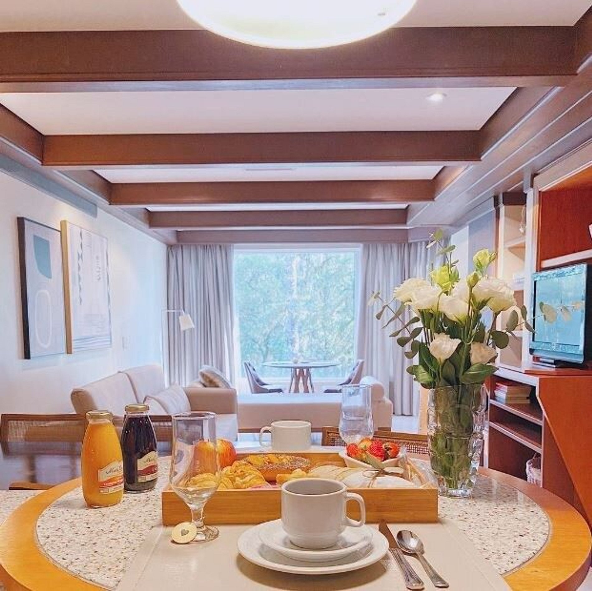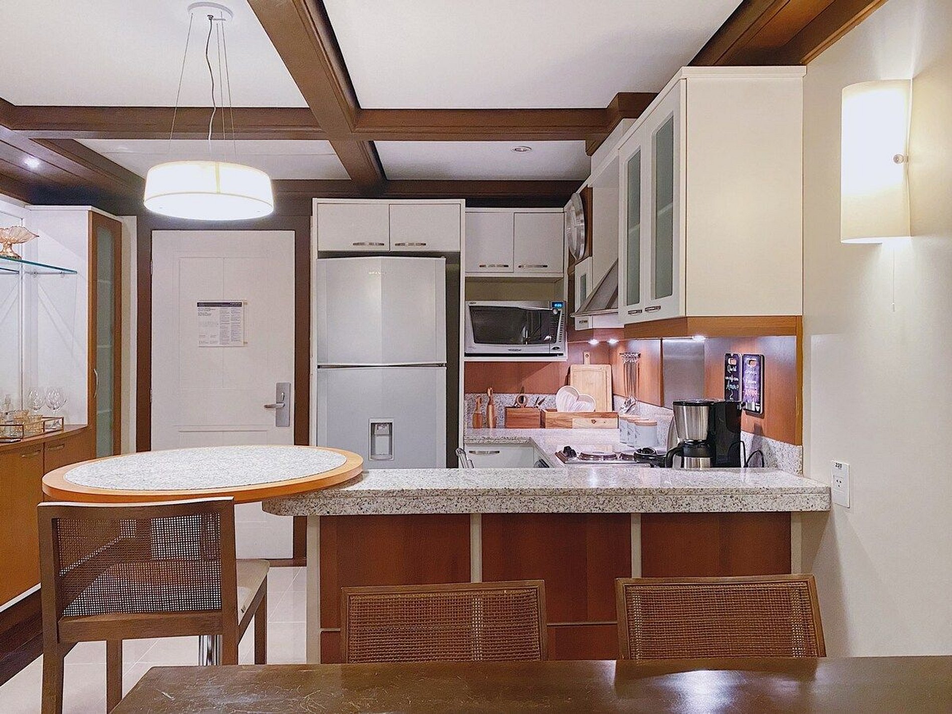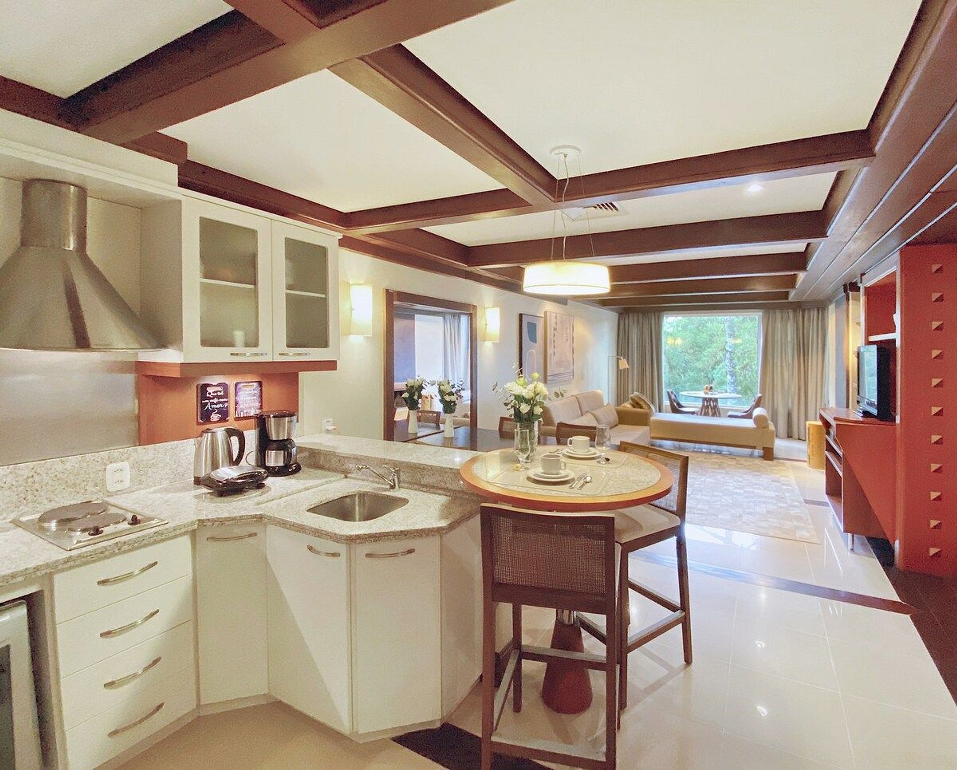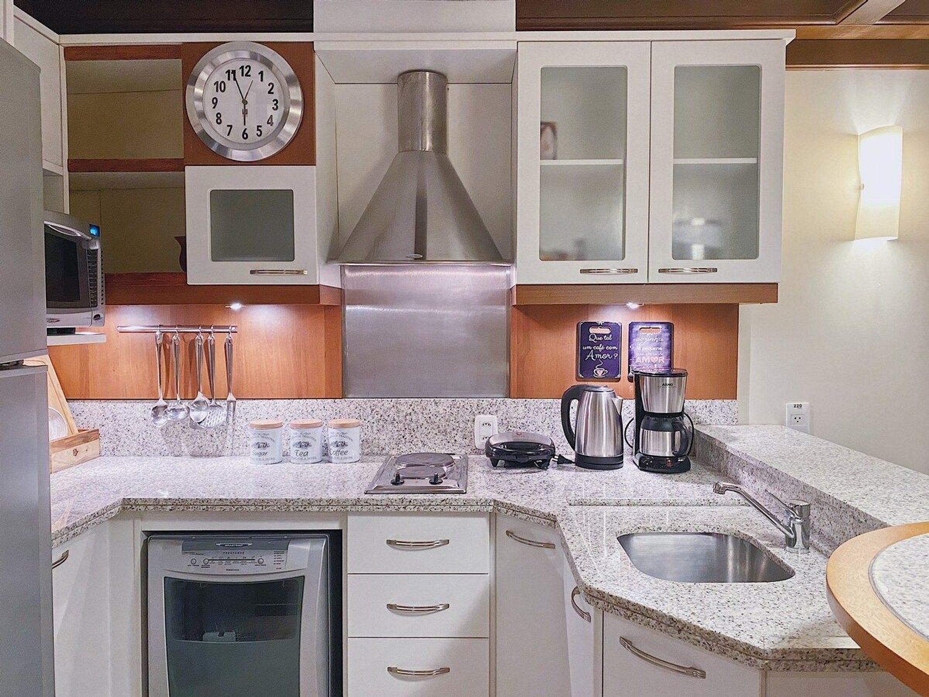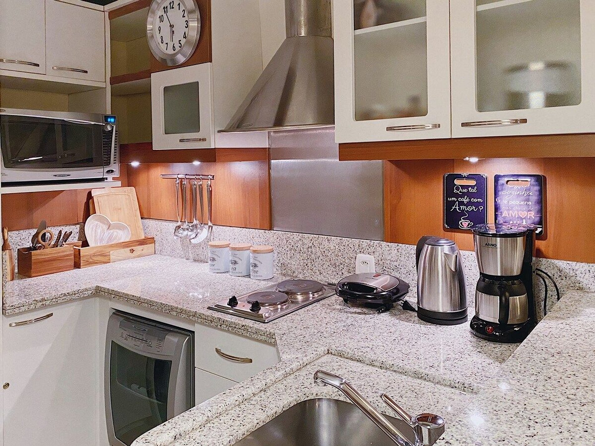 A acomodação possui serviço de hotel com limpeza diária, troca de toalhas, arrumação de cama e cozinha. A cozinha é muito bem equipada com todos os eletro domésticos necessários para cozinhar ou pedir delivery, além de todo o coberto de mesa. Temos cafeteira, chaleira elétrica, torradeira, micro-ondas, forno e fogão. Disponibilizamos de forma gratuita chá e café para sua maior conveniência. Equipado com conforto e funcionalidade para que você possa desfrutar de uma inesquecível estadia.