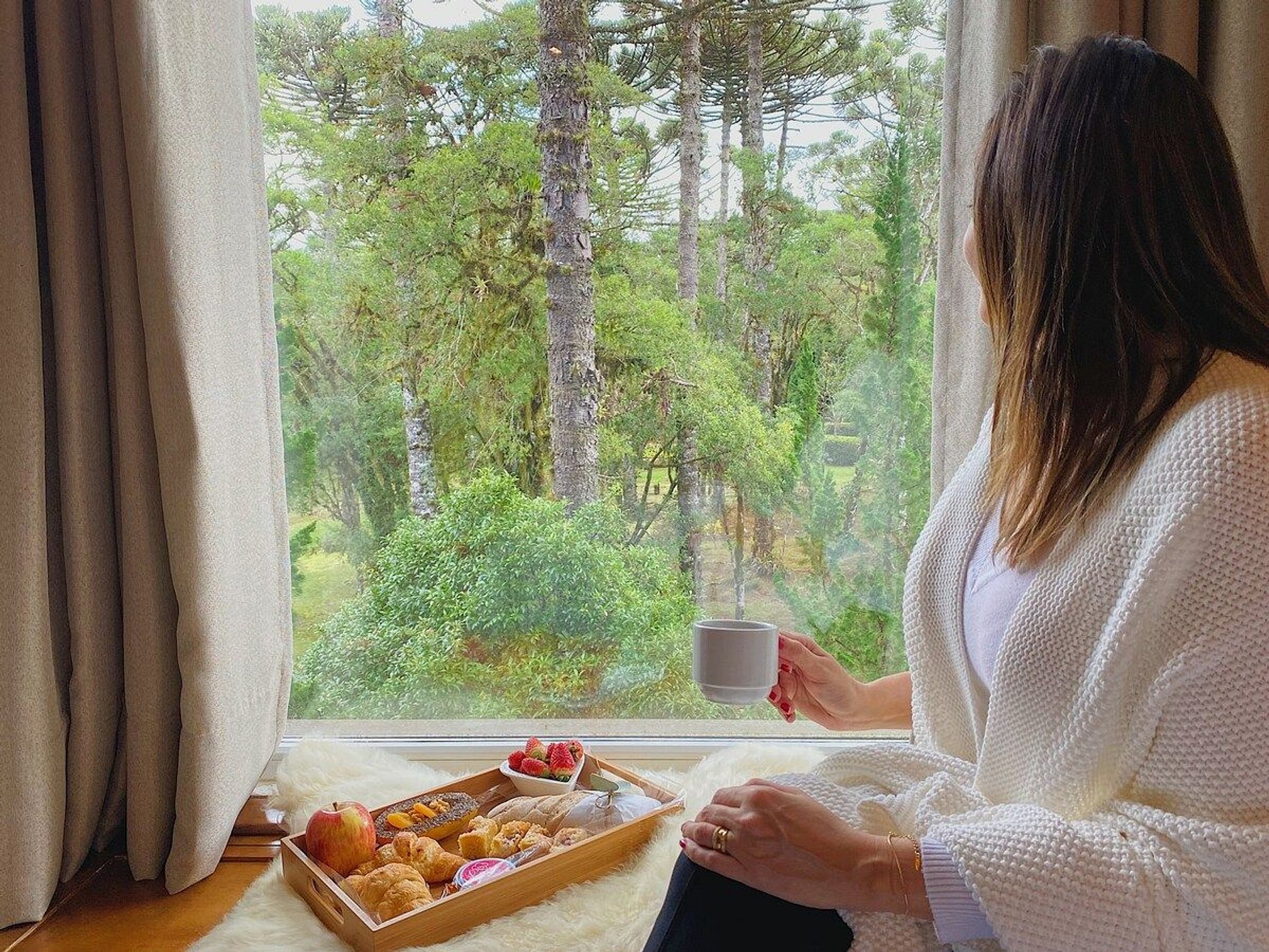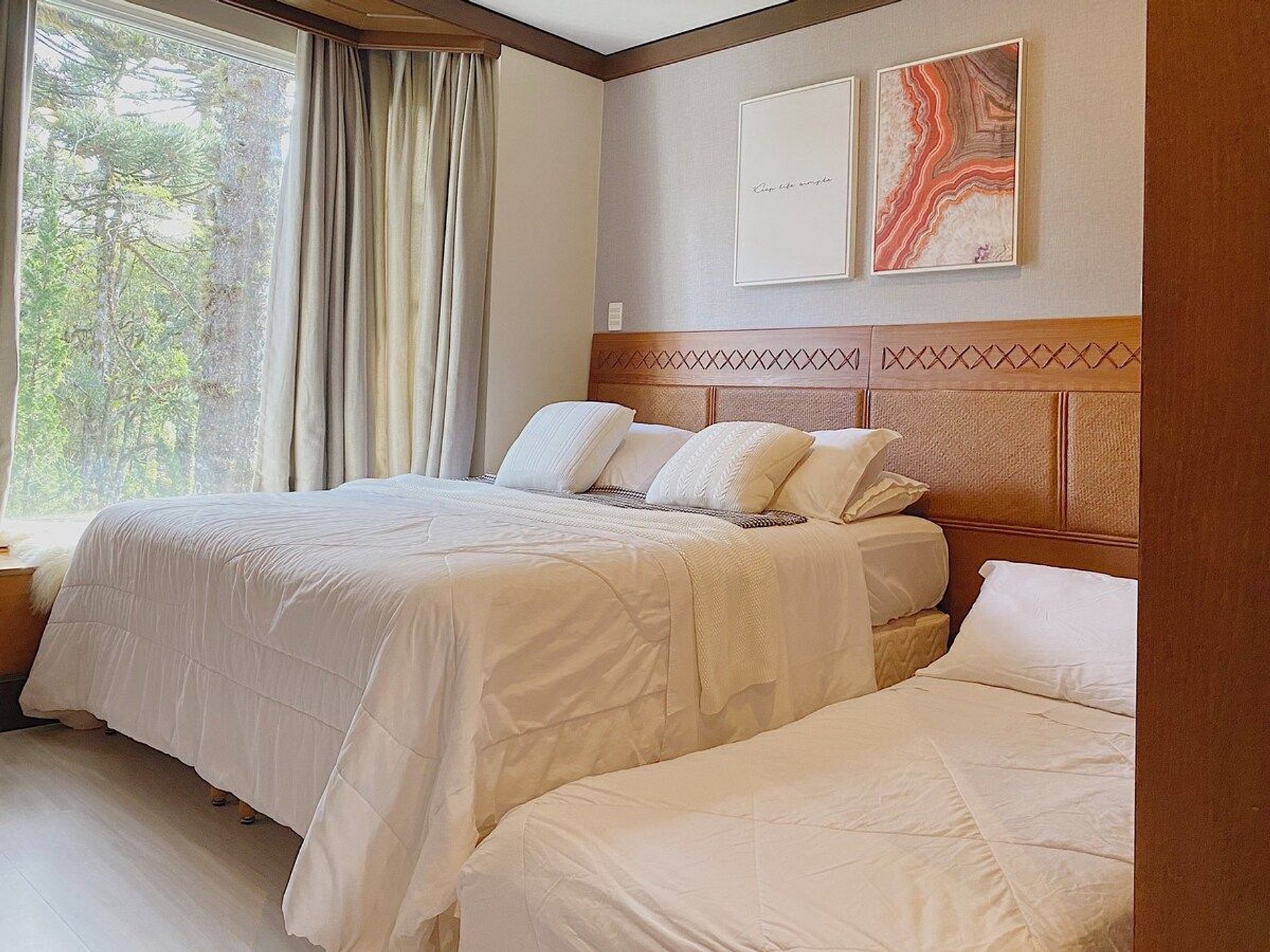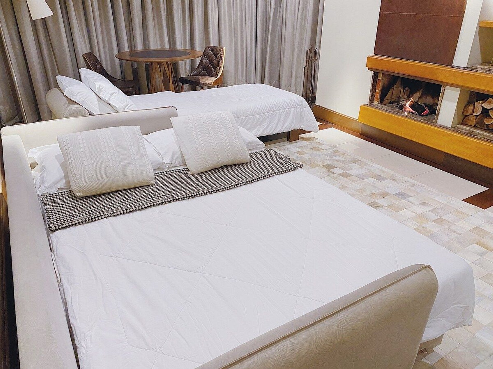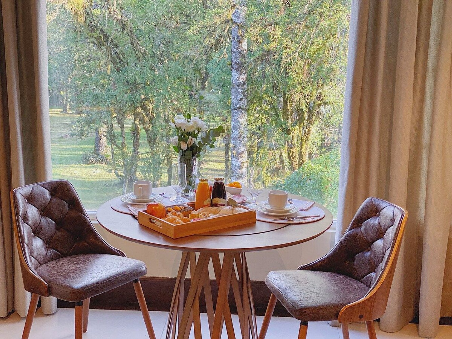 Lindo e aconchegante Flat/Suíte de Alto Padrão para até 06 pessoas, com quarto de casal, sala com dois ambientes com mesa para jantar, sofá cama + recamier, lareira e cozinha completa. O banheiro possui duas cubas, aquecedor de toalhas e banheira de hidromassagem. Nosso flat está localizado em meio a magnífica paisagem da região serrana e por isso a sala e o quarto possuem uma vista linda para um bosque de araucárias.