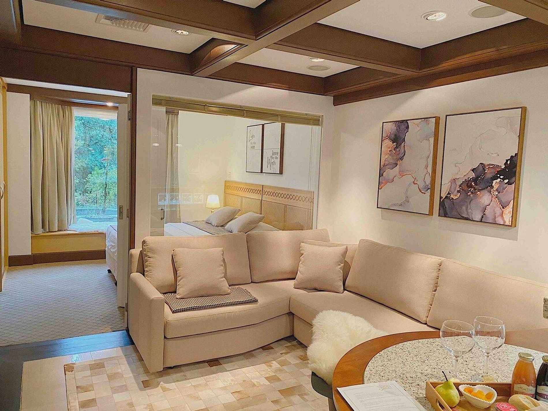 Lindo e Aconchegante Flat/Studio de Alto Padrão para até 04 pessoas, com quarto de casal, sala com dois ambientes e cozinha completa. Quarto e Sala com vistas para um lindo bosque. O banheiro possui duas cubas, aquecedor de toalhas e banheira de hidromassagem. Localizado em meio a magnífica paisagem da região serrana. Equipado com Elegância e Funcionalidade para que você possa desfrutar de uma inesquecível estadia.