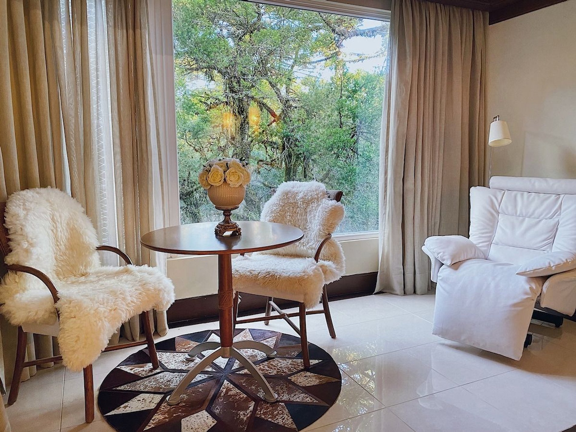 Lindo e aconchegante Flat/Suíte de Alto Padrão para até 06 pessoas, com quarto de casal, sala com dois ambientes com mesa para jantar, sofá cama + recamier, lareira e cozinha completa. O banheiro possui duas cubas, aquecedor de toalhas e banheira de hidromassagem. Nosso flat está localizado em meio a magnífica paisagem da região serrana e por isso a sala e o quarto possuem uma vista linda para um bosque de araucárias.