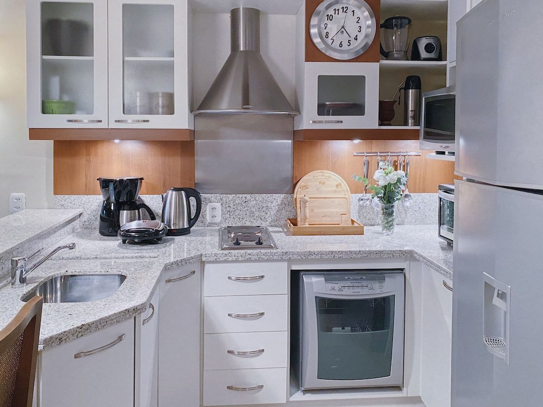 A acomodação possui serviço de hotel com limpeza diária, troca de toalhas, arrumação de cama e cozinha. A cozinha é muito bem equipada com todos os eletro domésticos necessários para cozinhar ou pedir delivery, além de todo o coberto de mesa. Temos cafeteira, chaleira elétrica, torradeira, micro-ondas, forno e fogão. Disponibilizamos de forma gratuita chá e café para sua maior conveniência. Equipado com conforto e funcionalidade para que você possa desfrutar de uma inesquecível estadia.