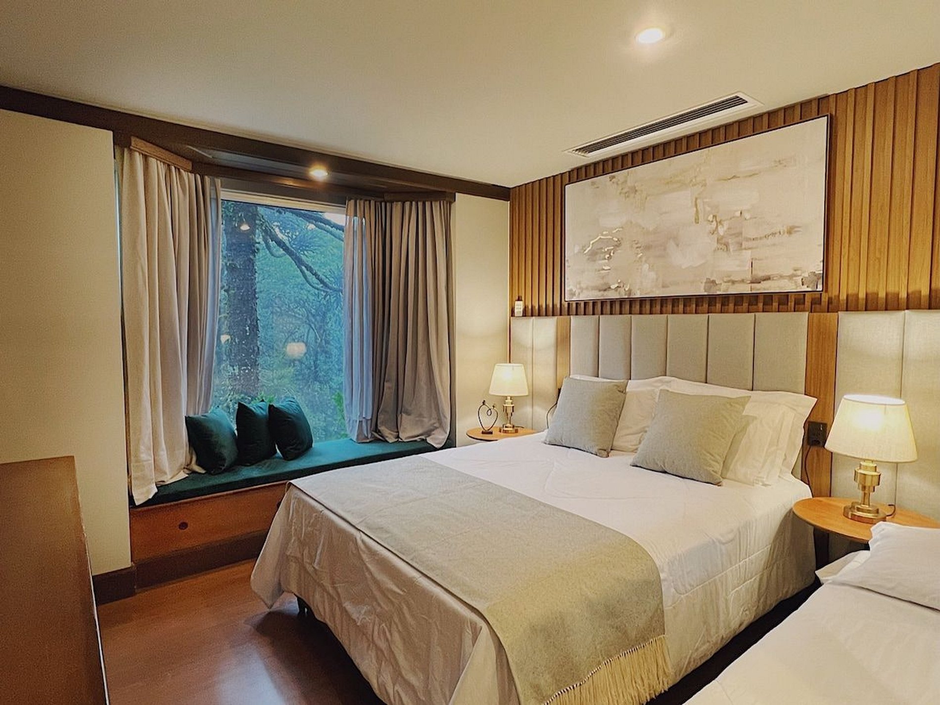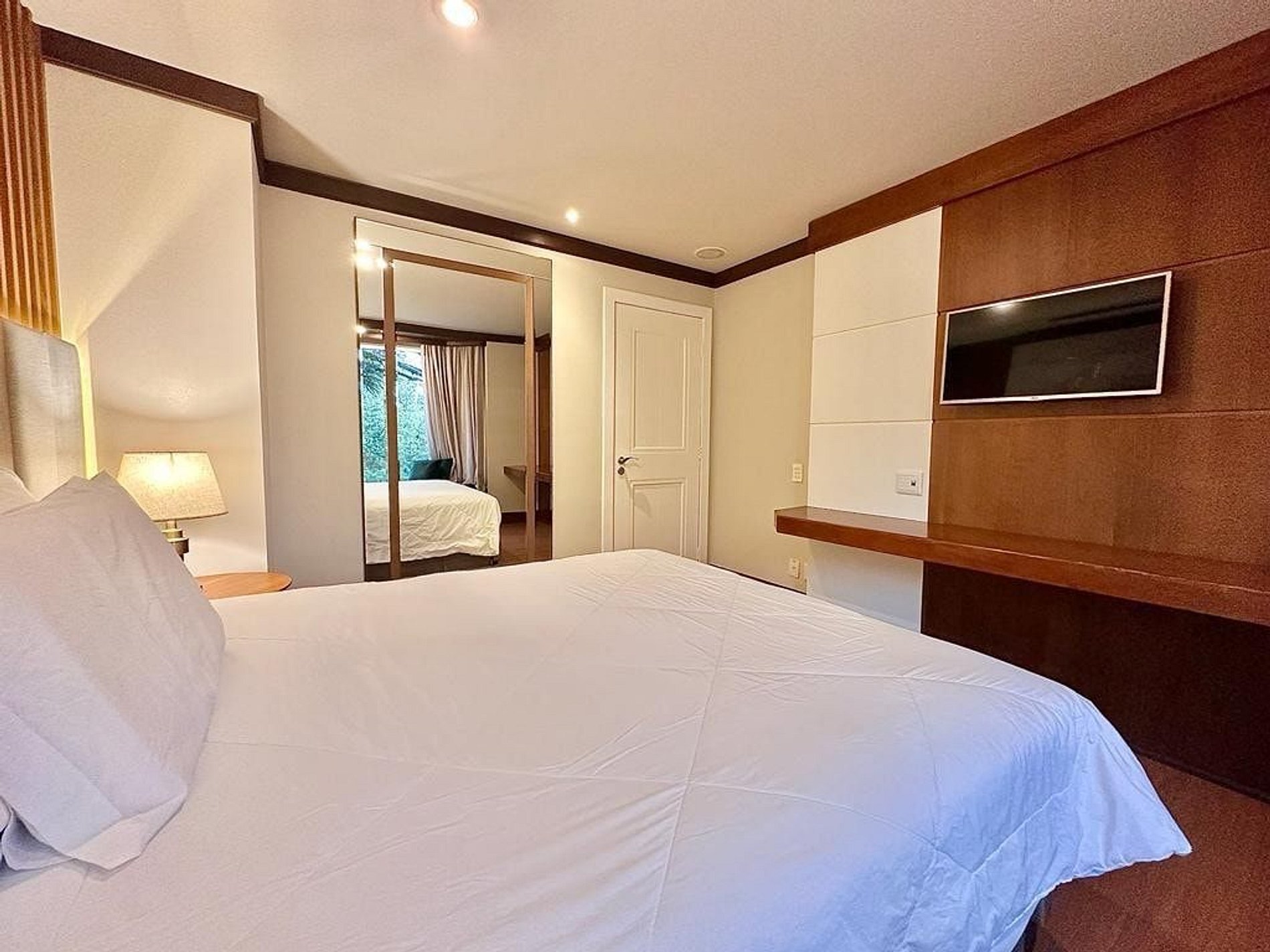 Ao entrar, seus olhos serão imediatamente atraídos para a lareira, que emana calor e sofisticação, criando o ambiente perfeito para noites a dois ou momentos inesquecíveis em família. Uma SmartTV está estrategicamente posicionada para aqueles momentos aconchegantes de cinema. O banheiro é um verdadeiro oásis, com duas cubas elegantes e uma banheira de hidromassagem, onde você pode relaxar e se mimar. A vista da suíte é uma janela para a natureza, com uma maravilhosa vista para um bosque que traz a serenidade da floresta até você.